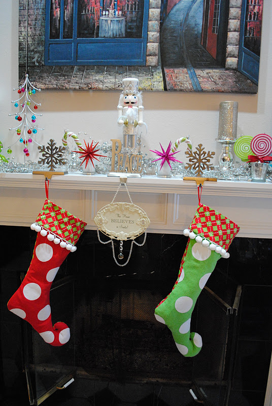 We love our new whimsy stockings! We added a bit of whimsy to our mantel this year too. The printable on the far right is FREE over at Today's Creative Blog.